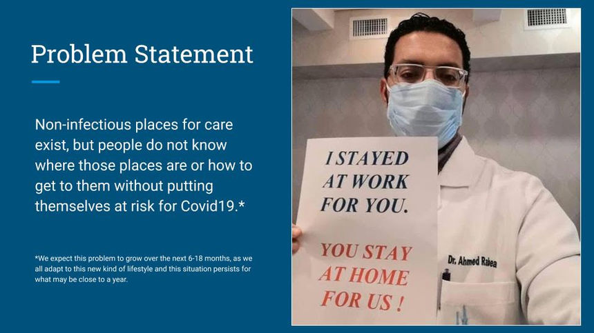 Clear Care is a solution for non-covid patients with medical needs. People with a medical need can now find specific help quickly and easily after they’ve been triaged as non-covid patients. Vulnerable populations such as cancer patients, diabetics, and people with a non-covid emergency can self-sort or be sent to an app from a practitioner and access the healthcare system safely.